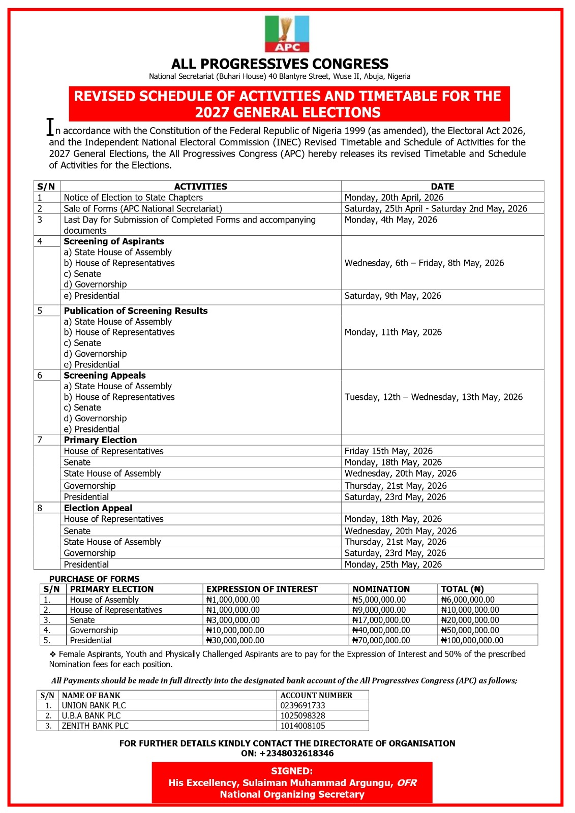 The All Progressives Congress (APC) has set the stage for the 2027 political showdown, releasing a revised timetable and schedule of activities for the general elections.