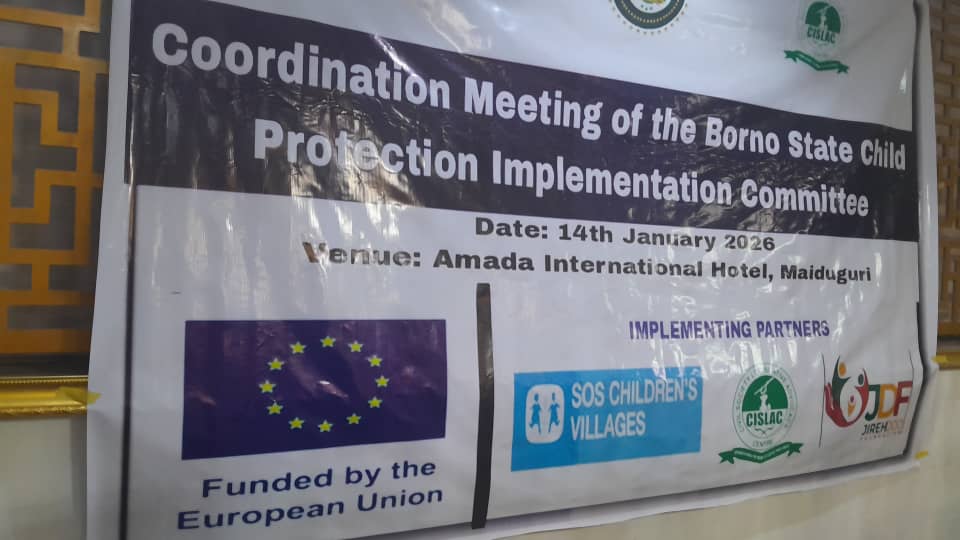 The meeting, held on January fourteenth, twenty twenty six, (14/01!2026) at the Amada International Hotel in Maiduguri, was supported by the European Union and brought together key implementing partners including SOS Children’s Villages Nigeria, CSSCIL, ZEGCAWIS and JDF.