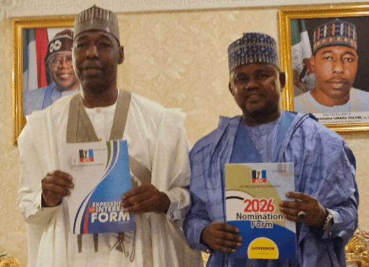 In a show of political strength, Gubio was flanked by prominent party figures, including Senator Mohammed Tahir Monguno and other APC stalwarts, signaling strong backing within the ruling party’s Borno structure.