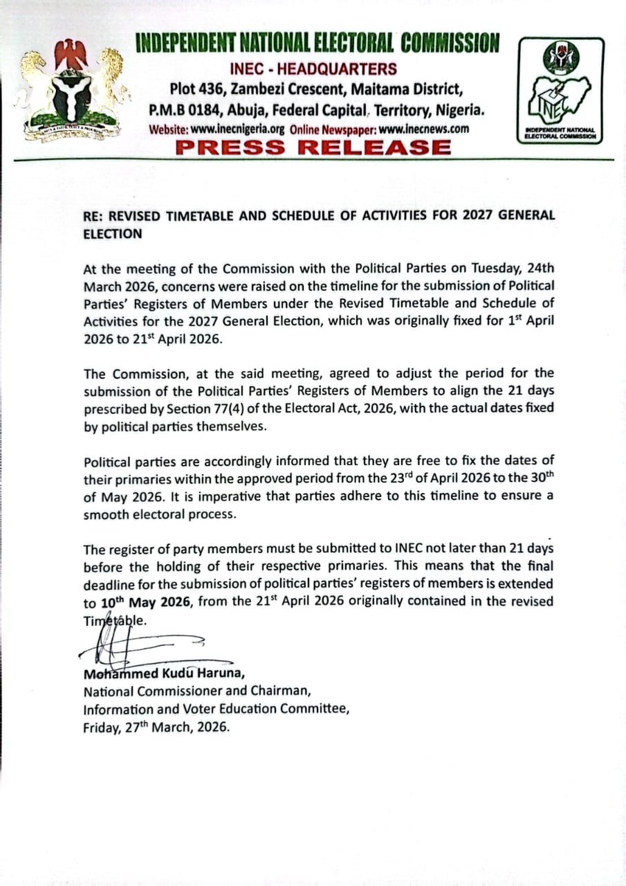 The Independent National Electoral Commission has adjusted its timetable for the 2027 General Election, granting political parties more breathing space to prepare their internal processes.
