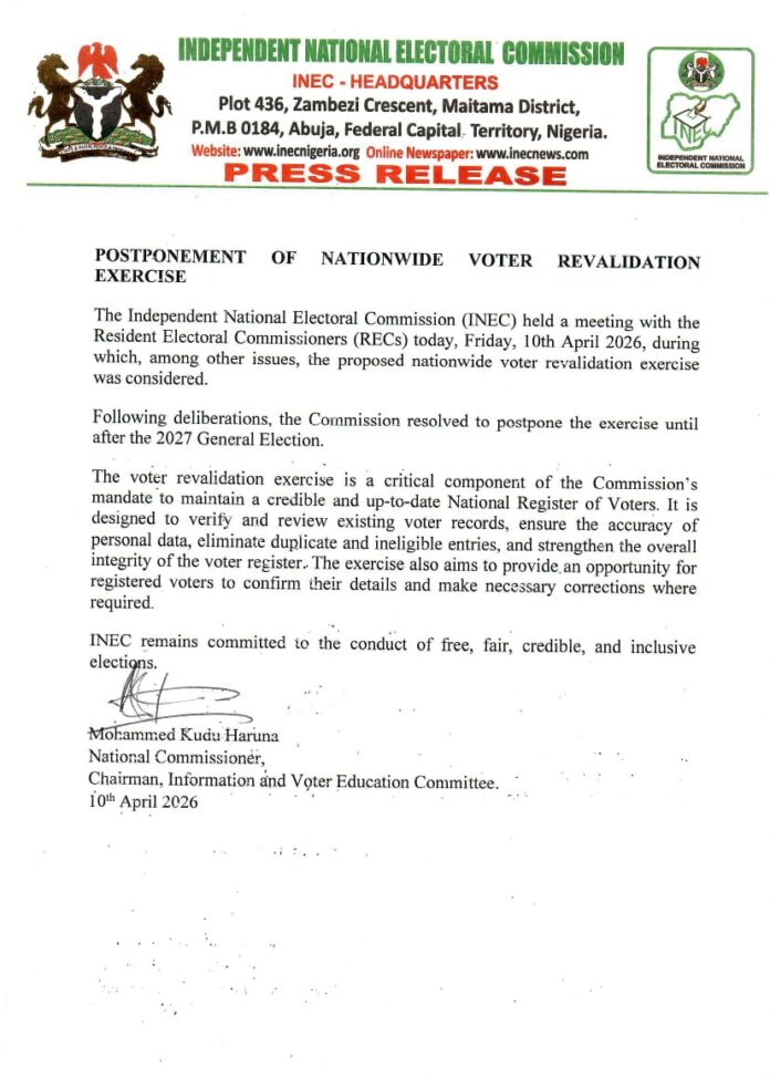 The Independent National Electoral Commission (INEC) has postponed the planned nationwide voter revalidation exercise until after the 2027 General Elections.
