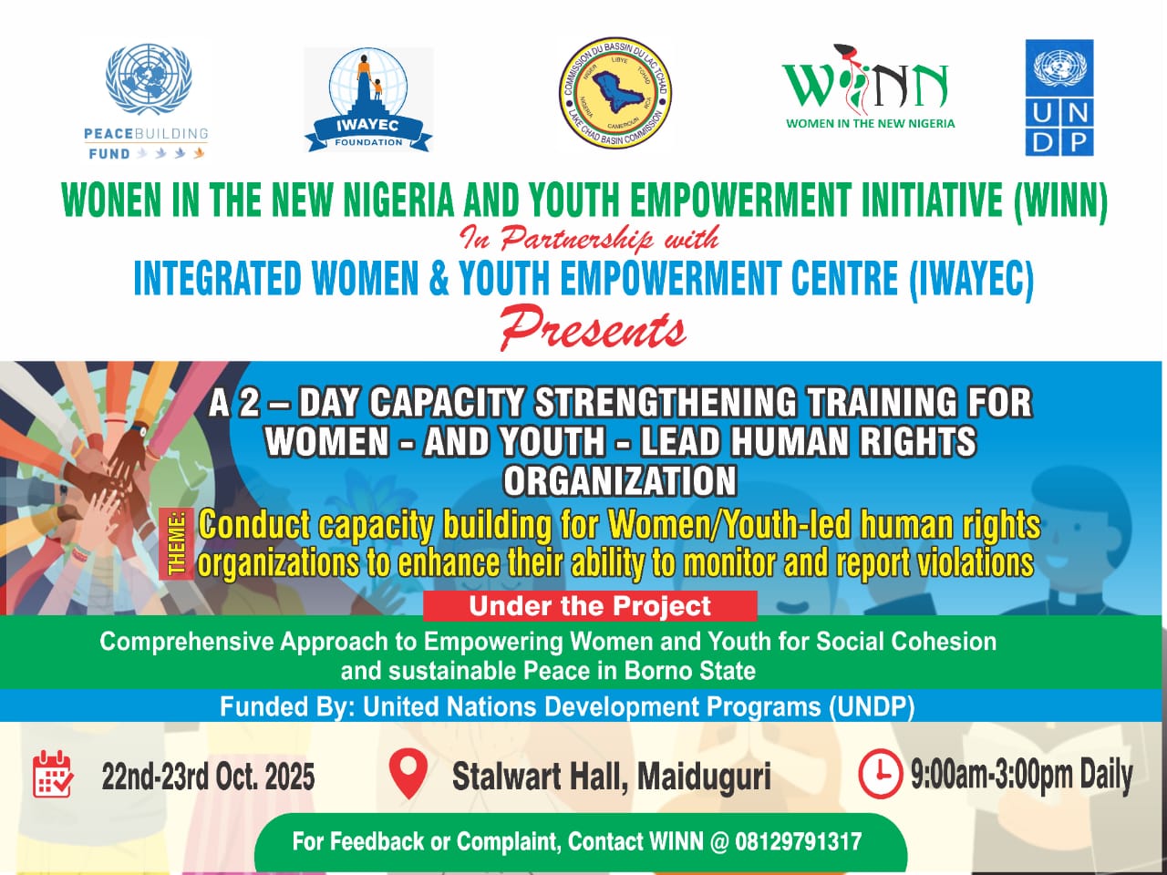 To tackle abuses resulting from years of Boko Haram insurgency in Borno State, a non governmental organisation ( NGO ) , Women in the New Nigeria and Youth Empowerment Initiative ( WINN), in partnership with Integrated Women, Youth and Child Foundation ( IWAYEC ), has trained 50 women and youth led civil society organizations ( CSOs ) in the State to enhance their ability to monitor and report human rights violations .