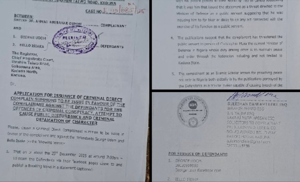 According to the complaint, the defendants — George Udom and Bello Isiaka — allegedly circulated a Facebook post on December 23, 2025, falsely attributing to Sheikh Gumi a chilling threat against Nigeria’s Minister of Defence, Christopher Musa.