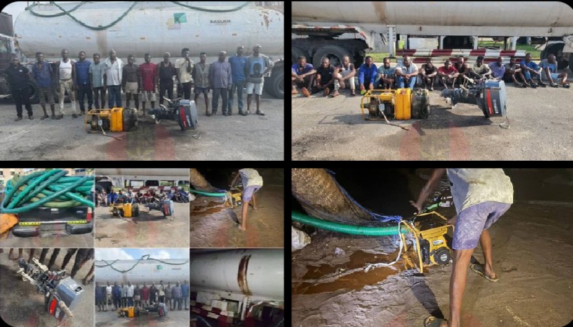 A haul of items recovered at the scene included a tanker truck loaded with siphoned fuel, a Lexus Highlander SUV, a Ford Hilux vehicle, a generator-powered pumping machine, a 40HP boat engine, and large quantities of industrial hoses used for the illegal operation.