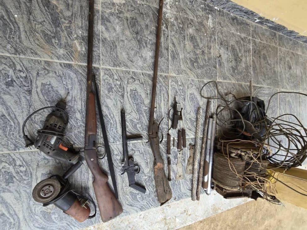 A thorough search of the illegal factory yielded a cache of weapons and manufacturing materials, including three locally made guns, five metal pipes, two iron rods, assorted copper wires, and two flat metal plates used in crafting gun butts. Tools recovered from the scene included a welding machine, an electric screwdriver, and an electric filing machine.