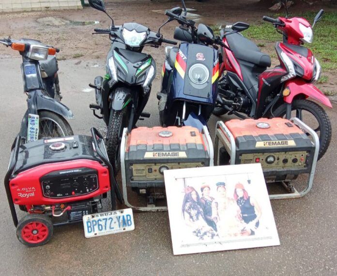 A thorough search of the premises led to the recovery of two locally made double-barrel guns, expended cartridges, motorcycles, generators, mobile phones, a police crest, jungle boots, machetes, and a special forces vest, among other exhibits believed to be linked to ongoing investigations.